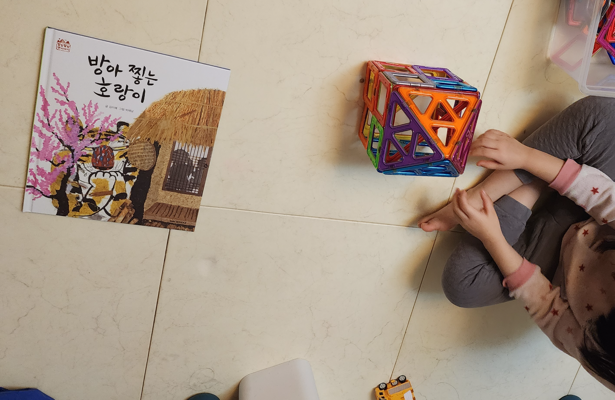 호랑이를 데리고 이 집, 저 집 옮겨 다니며 자기 전 재미난 활동을 할 수 있었다.