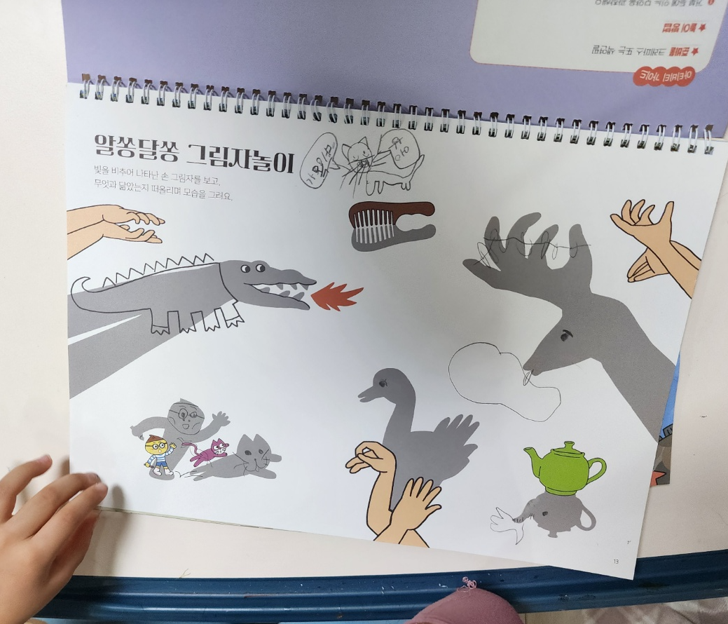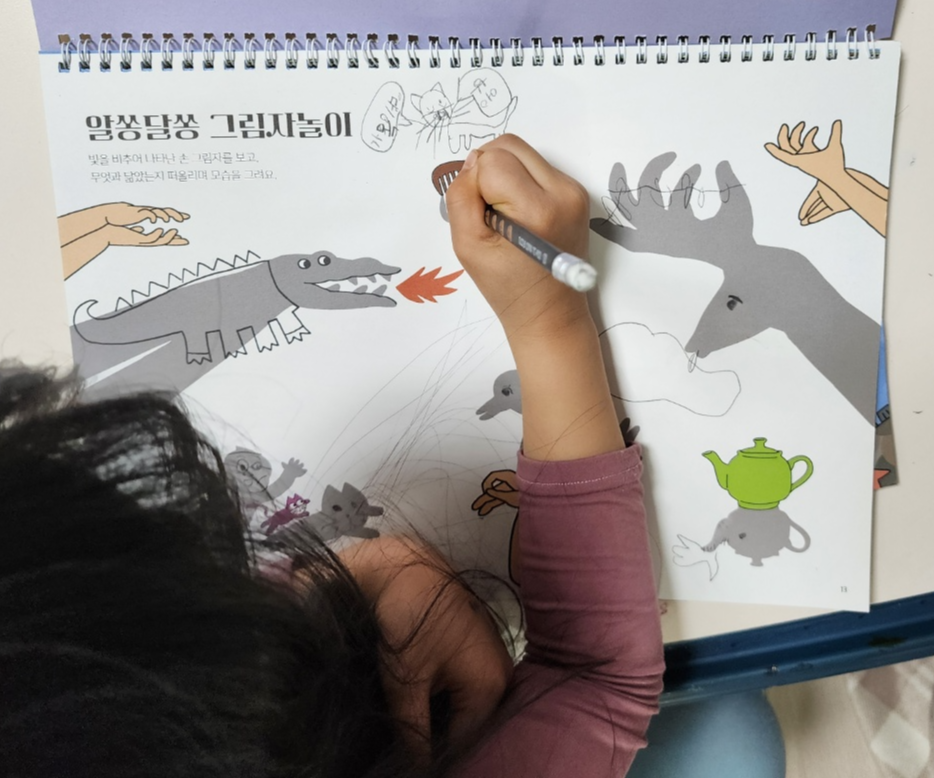 먼저 악어가 예시로 나와있다. 이렇듯, 틀에 박히지 않은 다양한 모양으로 그림자에 생명을 넣어주는 활동이다.