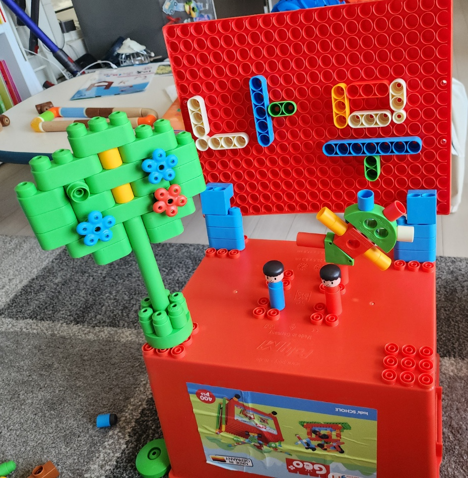 나는 설명서가 있으면 순서대로 만드는데, 아이는 전체 그림만 보고 만들고 있다.