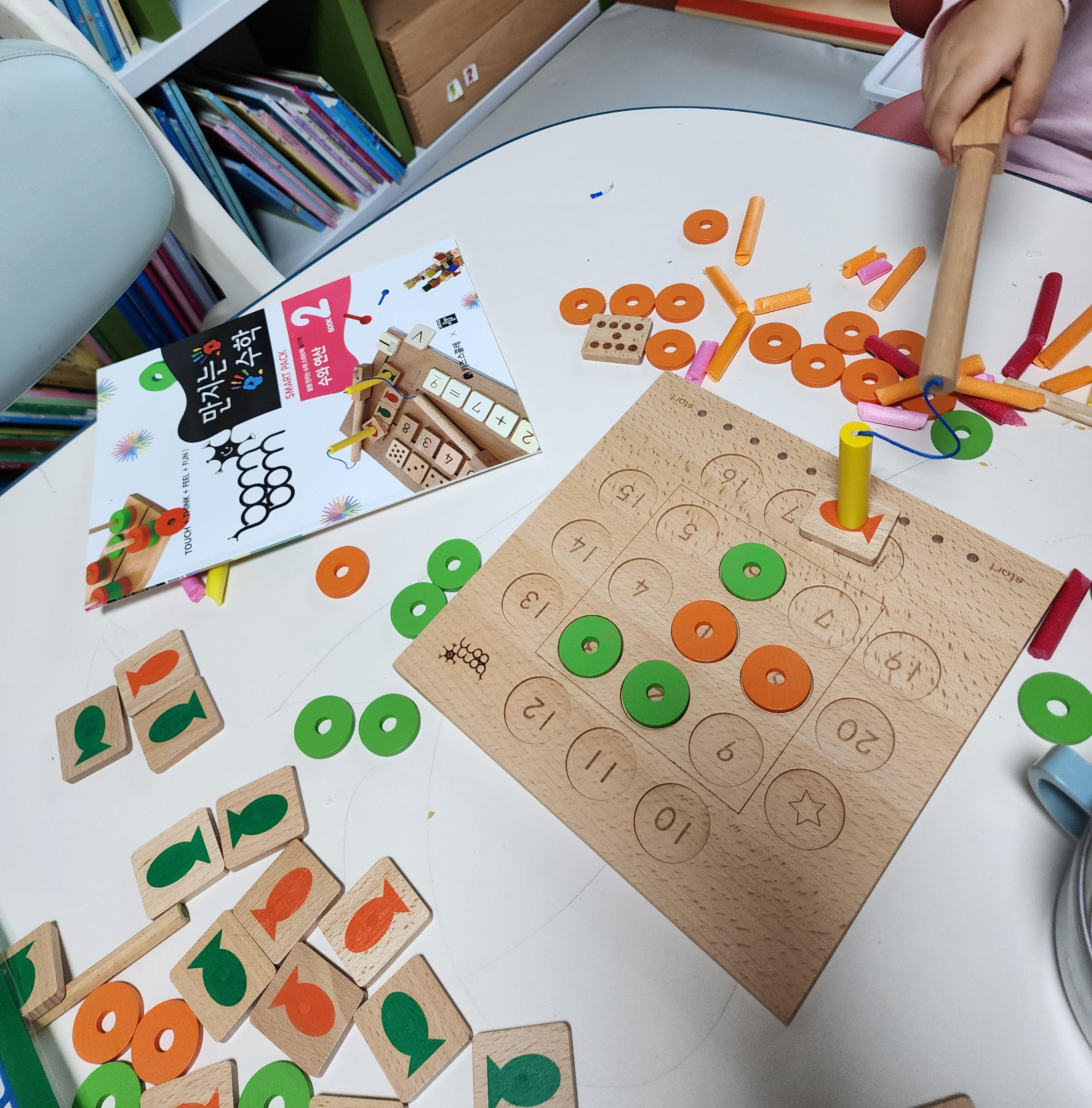 하원해서 책을 읽고 있는 아이를 부르기 전에 미리 책을 보고 게임에 필요한 교구들을 미리 꺼내어 놓았다.