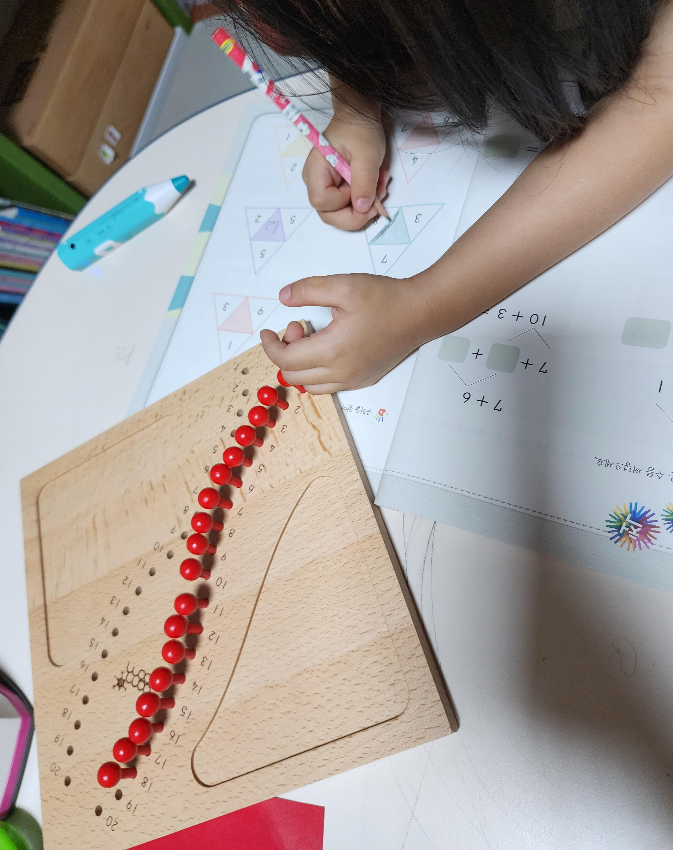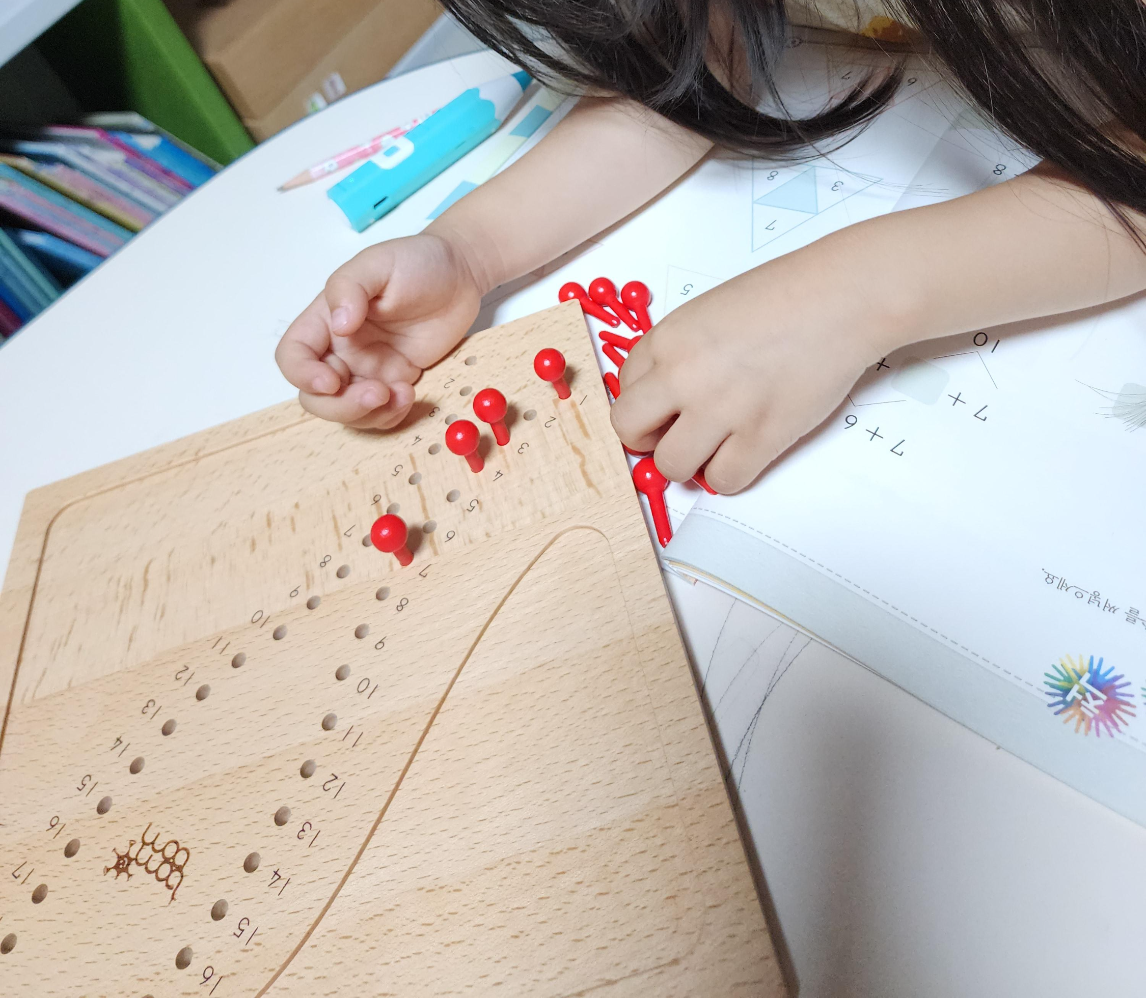 그래도 이제는 고리를 앞에 놔두 힘들면 고리로 세어보라고 했더니 제법 잘 가져와서 올려놓는다.