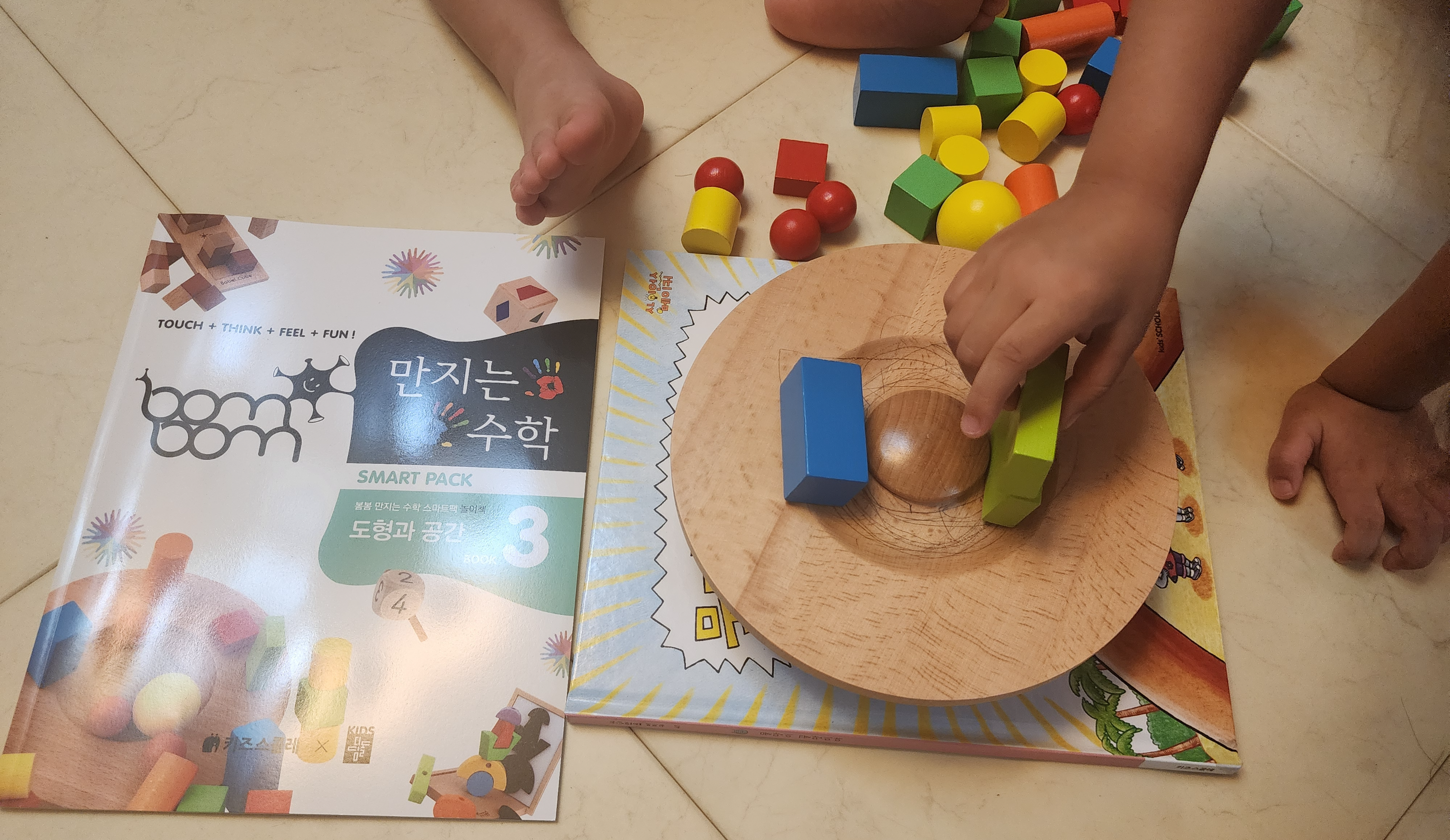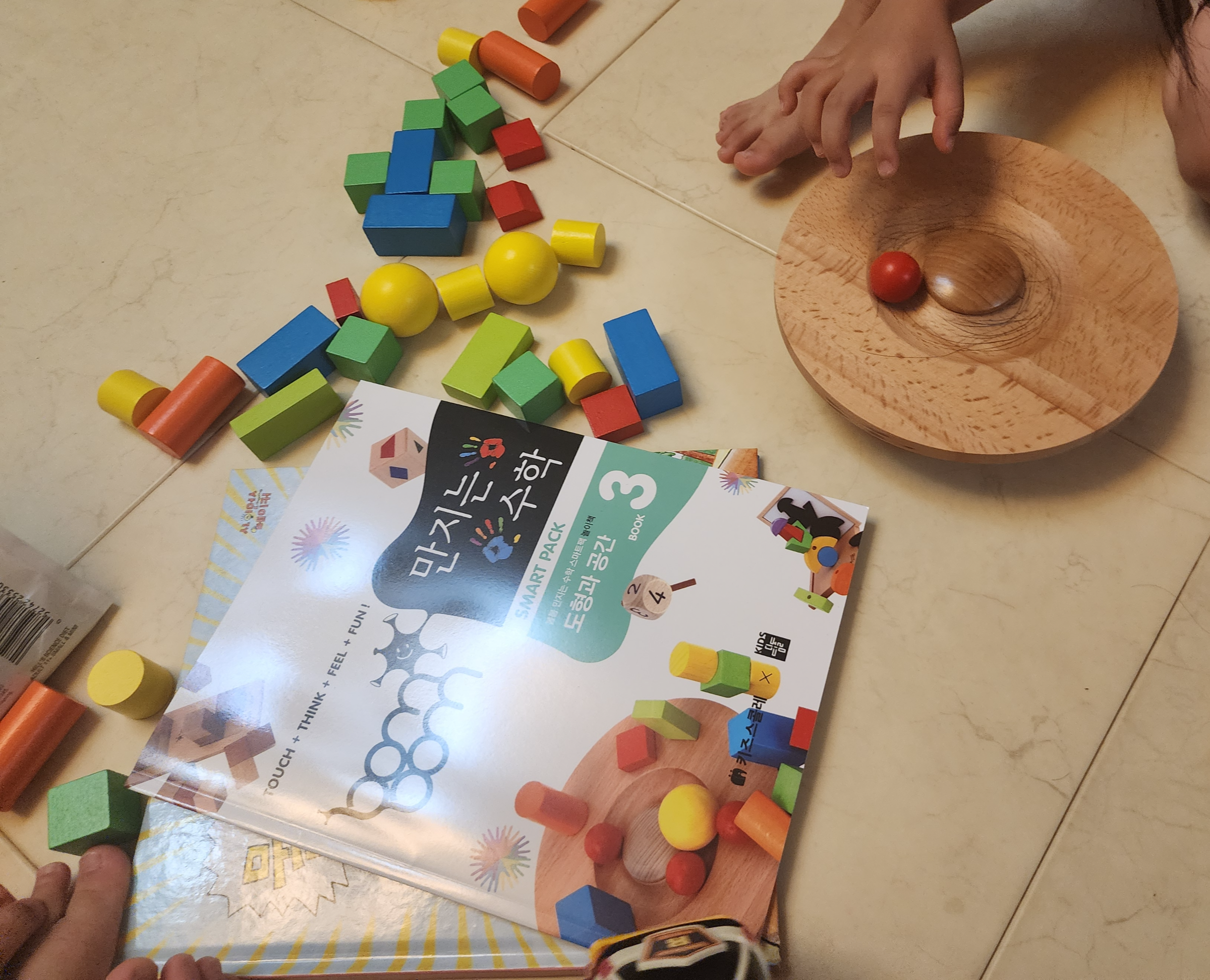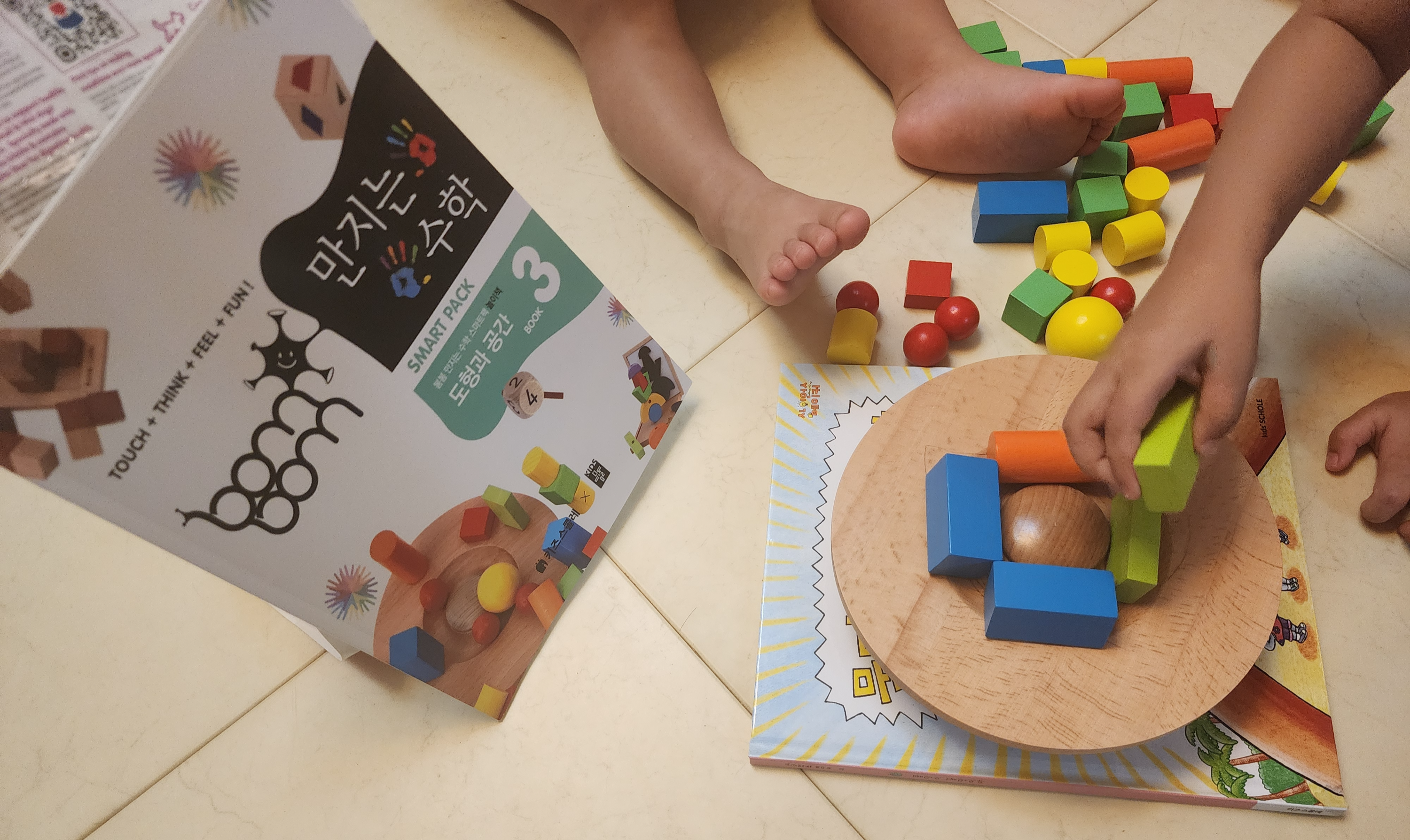 매트바닥이서 바닥에 책을 놓고 그 위에 교구를 놓았다.