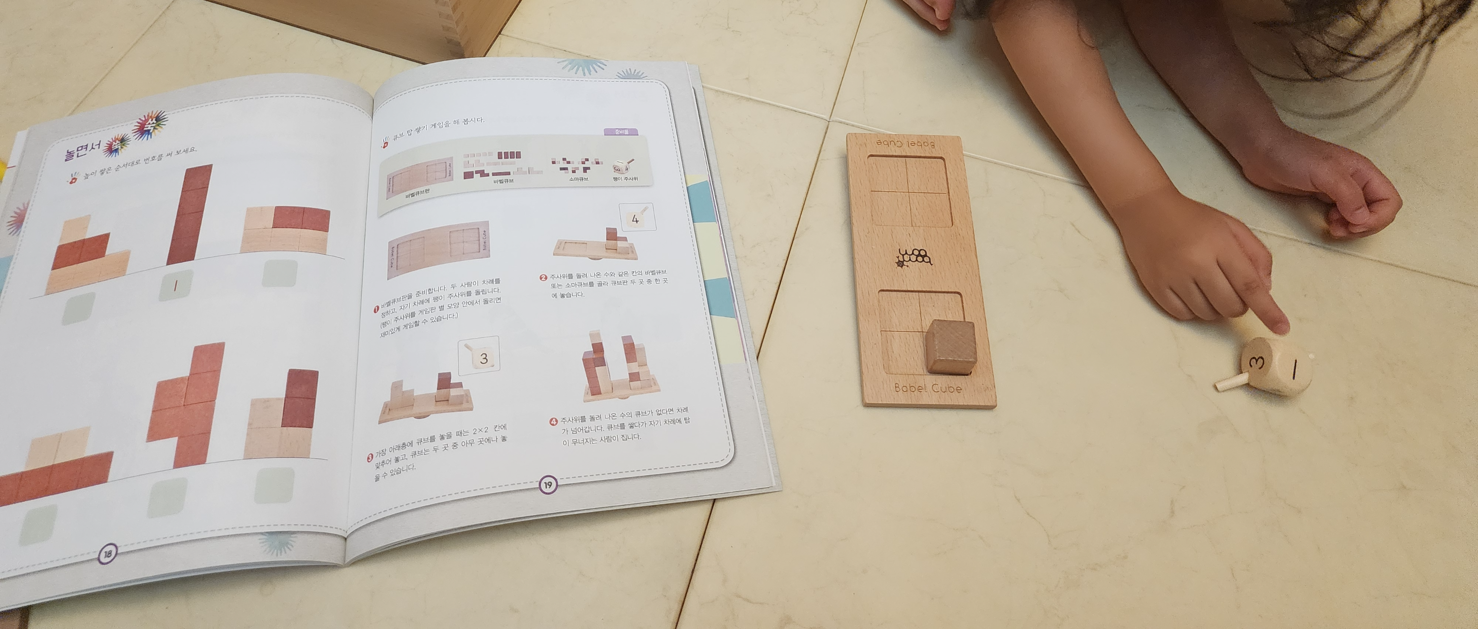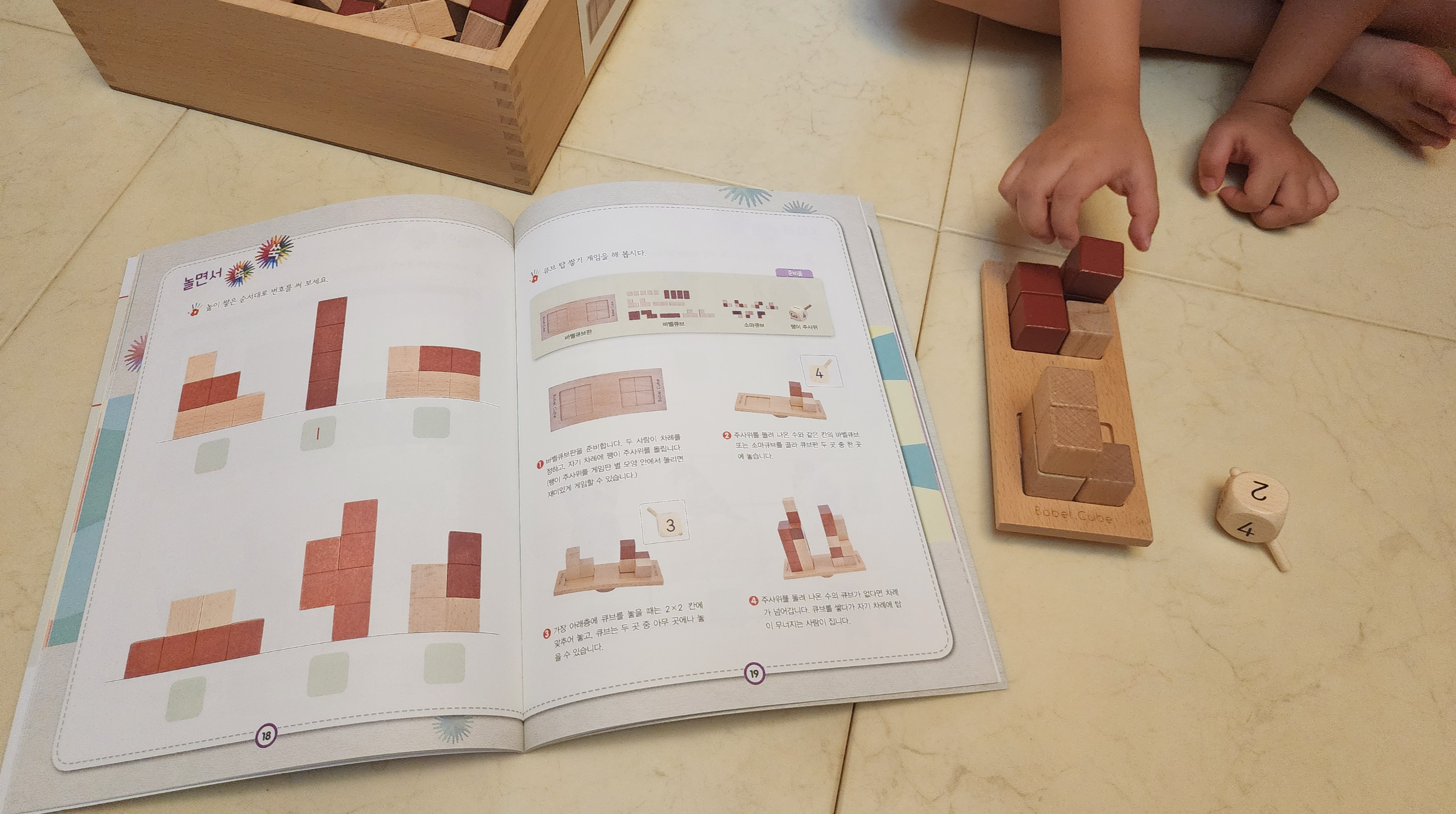 처음에 아이한테 숫자 4가 나왔는데, 네모는 생각을 못하고 다른 큐브를 올렸다.