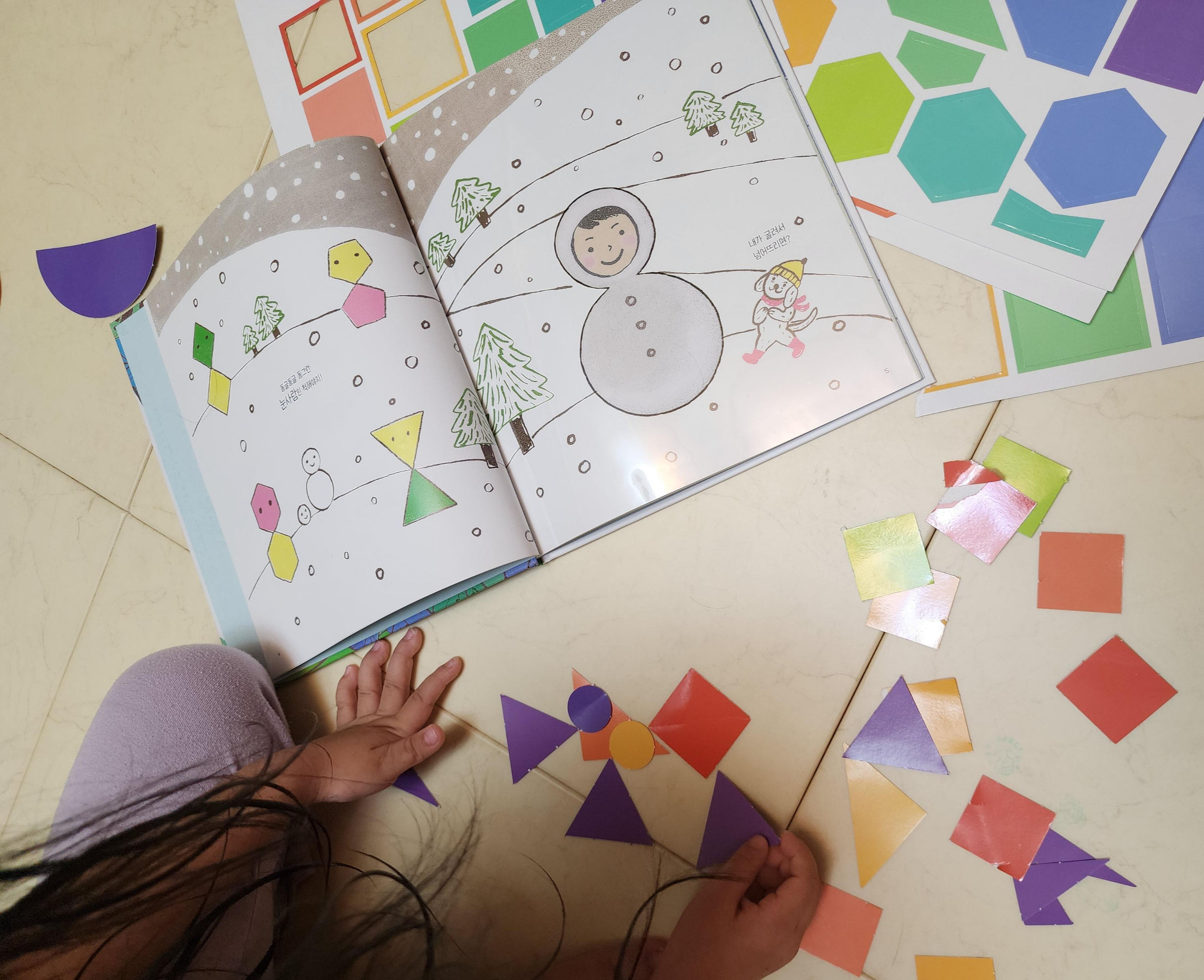 중간에 한장씩 투명한 필름에 인쇄가 되어 있고 넘겨보면 같은 모양을 만들 수 있게 도형을 나눠놨다.