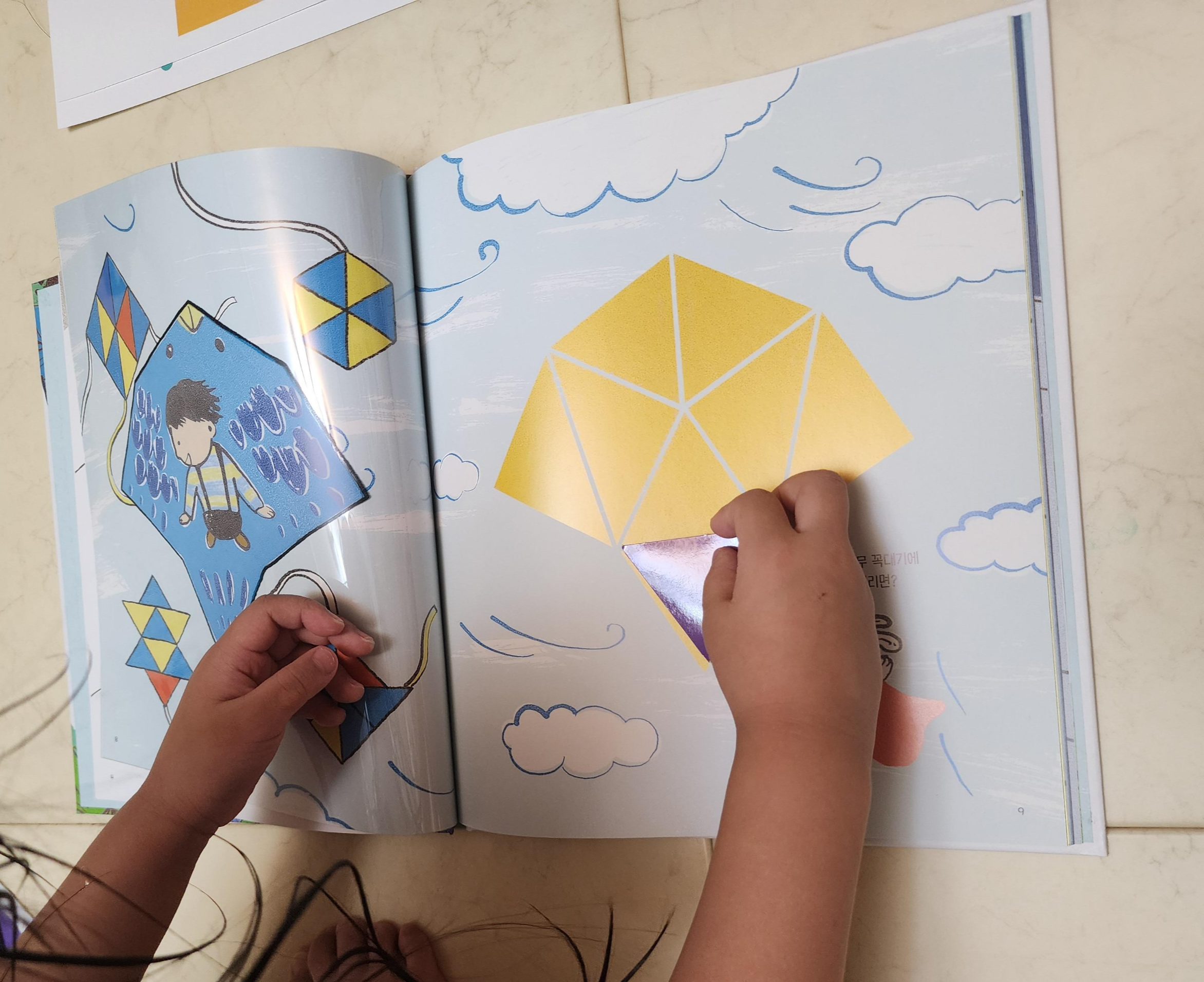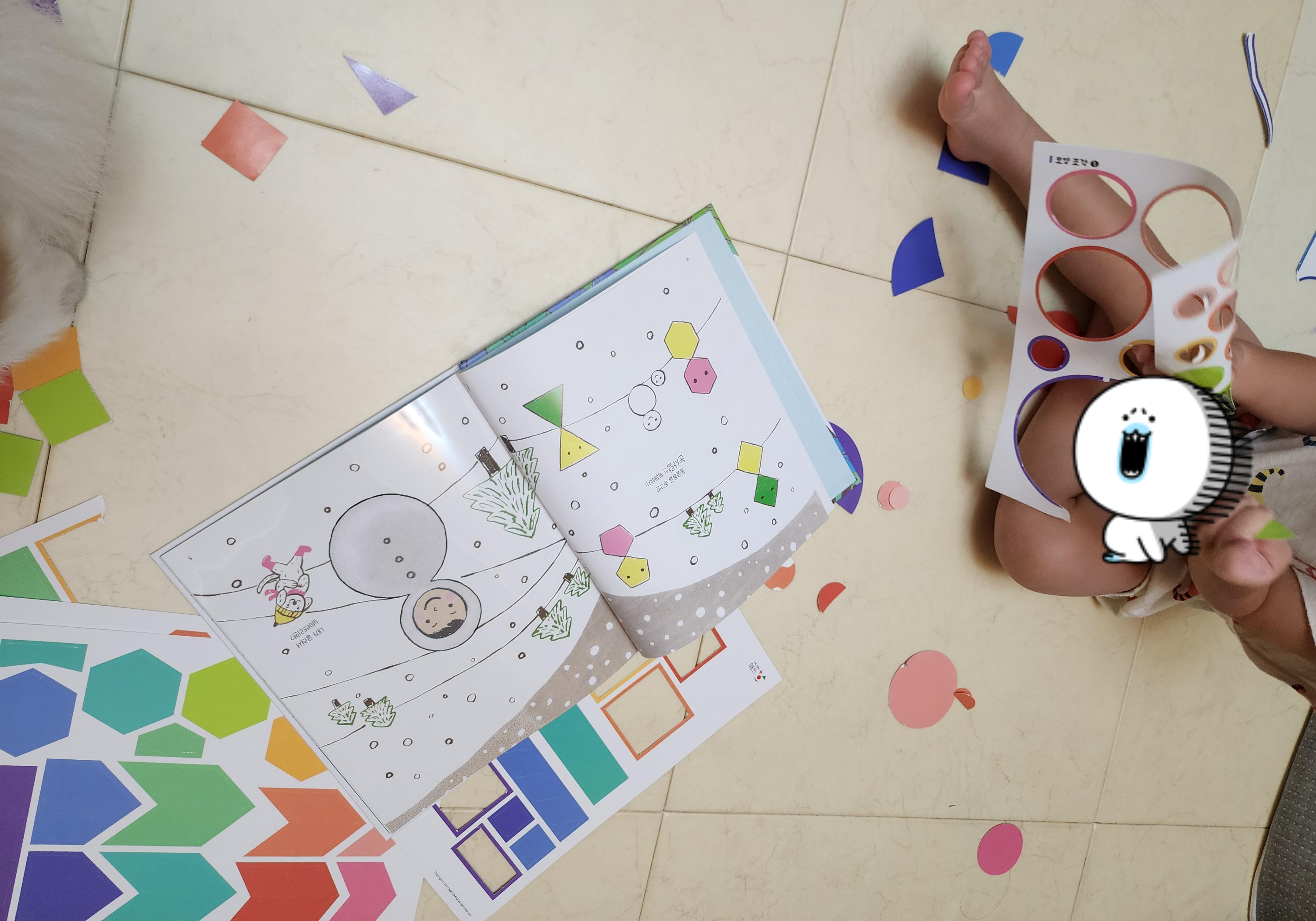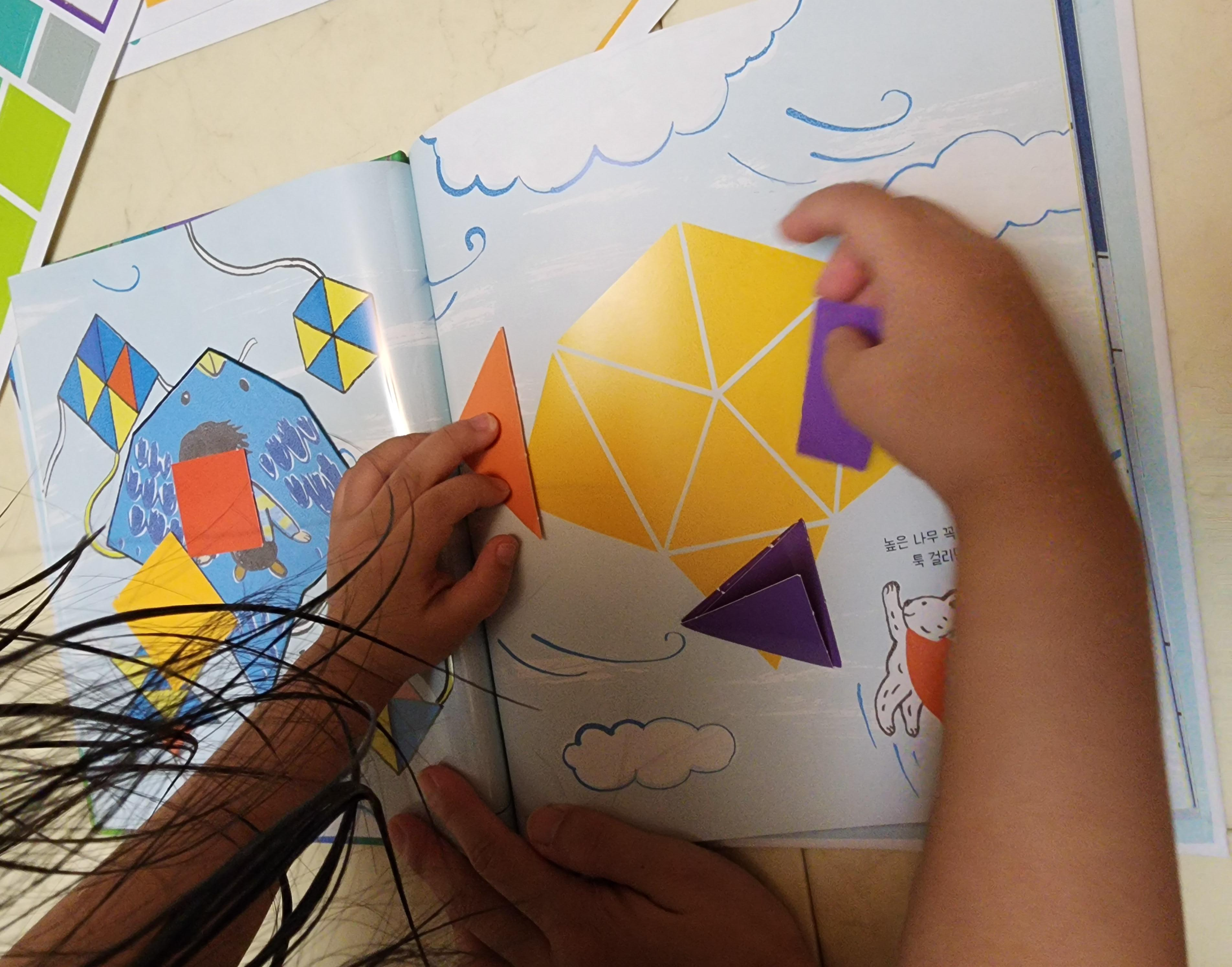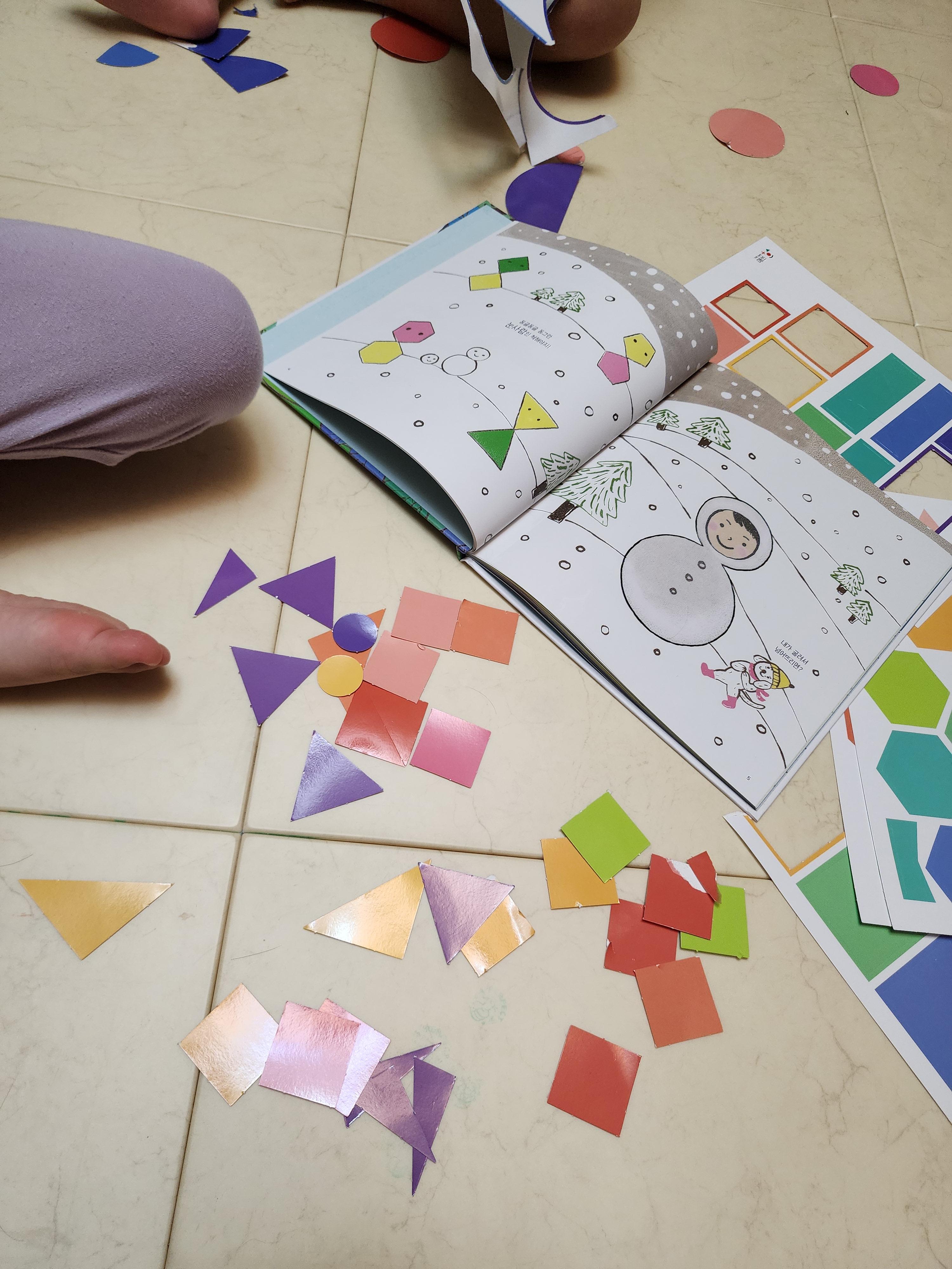 중간에 한장씩 투명한 필름에 인쇄가 되어 있고 넘겨보면 같은 모양을 만들 수 있게 도형을 나눠놨다.