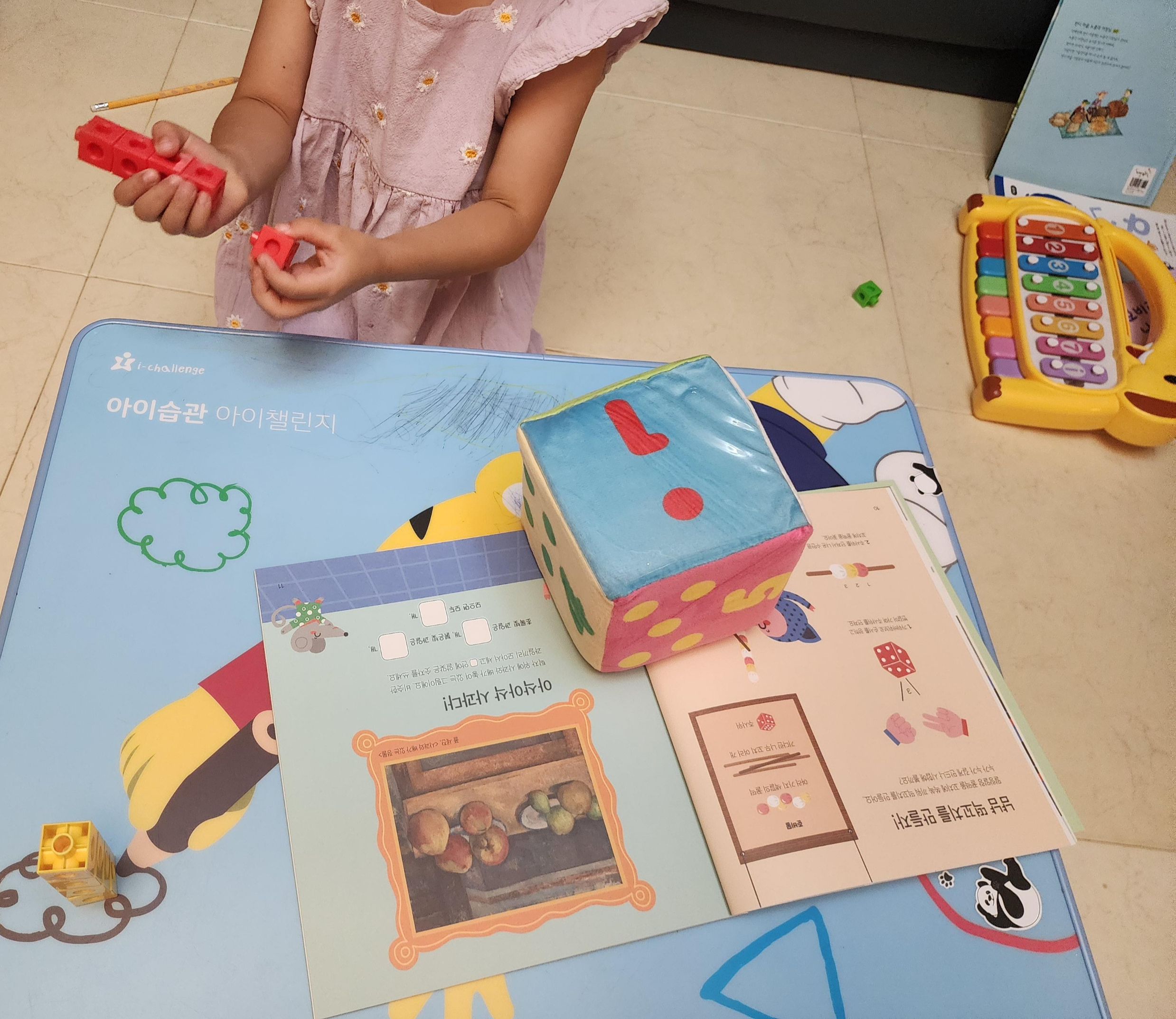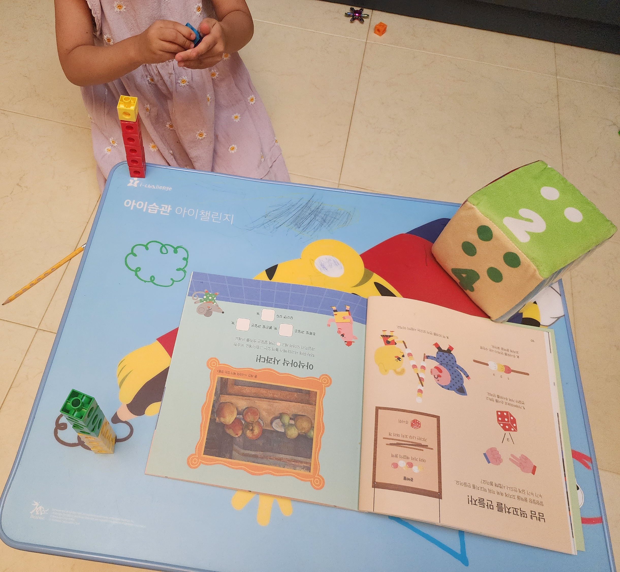 6세아이. 아직은 문제만 보고 생각하기 어려워 이렇게 항상무언가 교구를 꺼내야 이해가 쉽다.