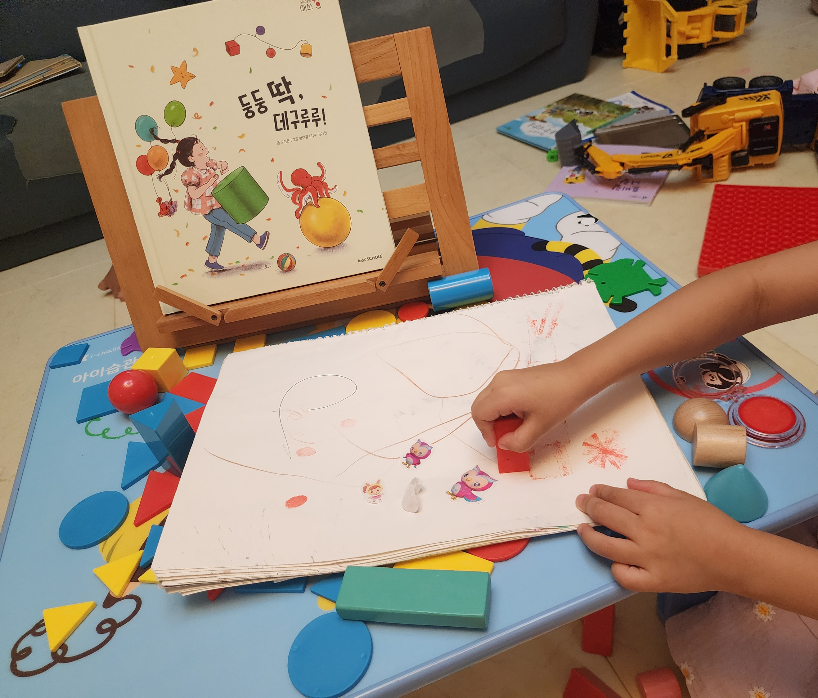 엄마의 의도와는 별개로 신나는 도장 찍기 놀이에 빠져서 이것저것 뭐든 찍어보고 있다.