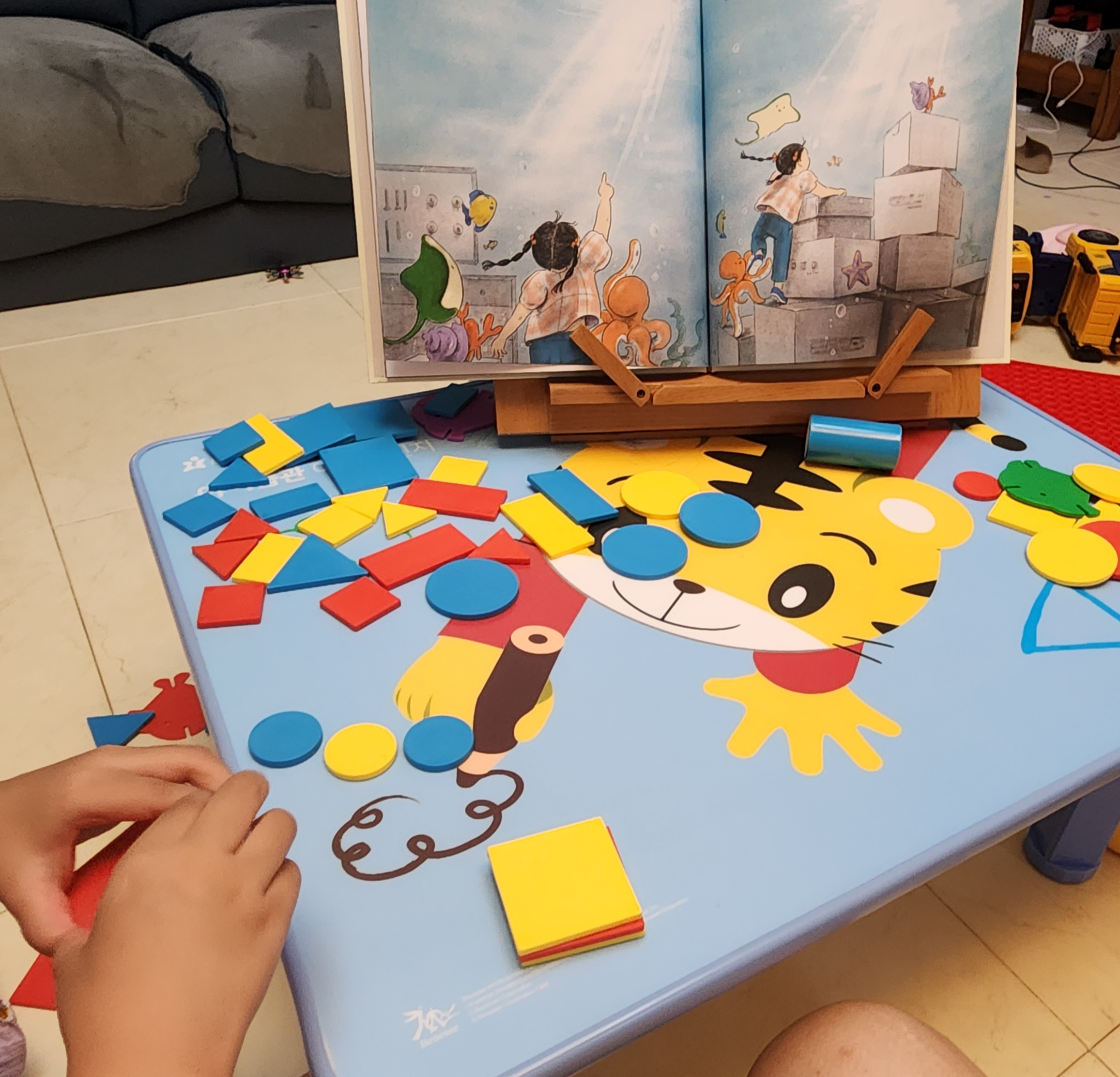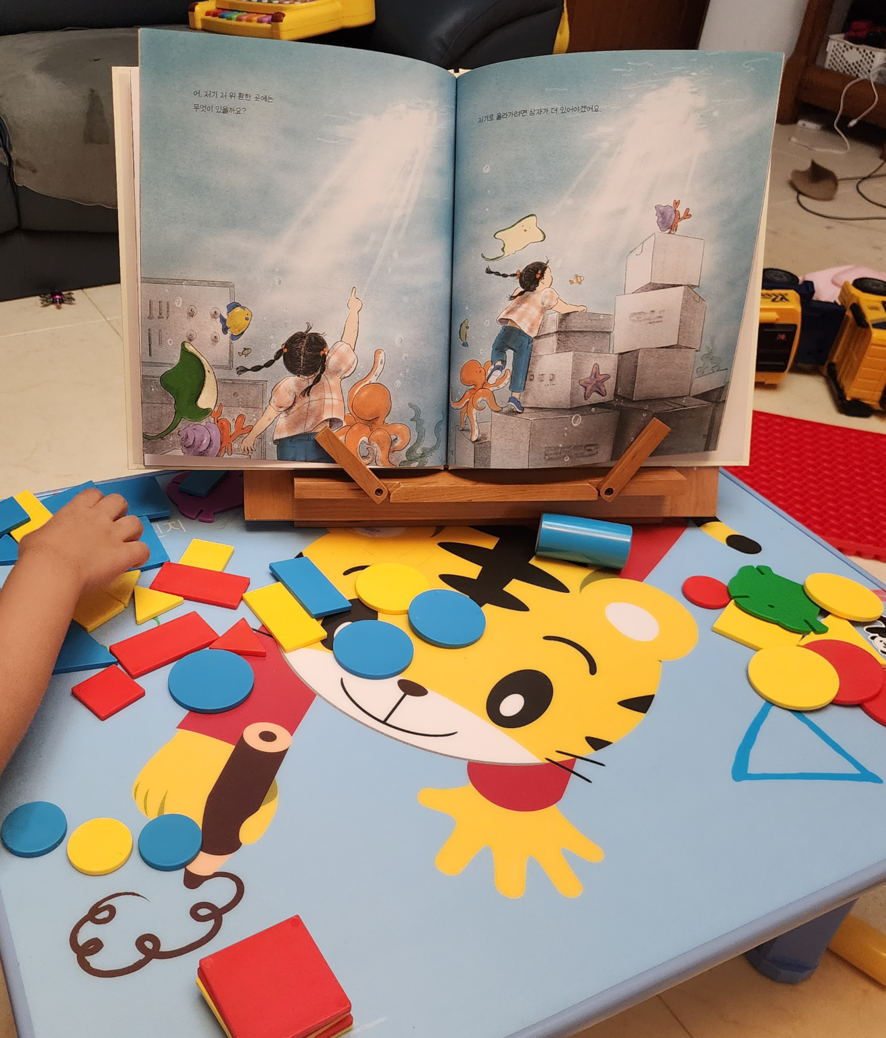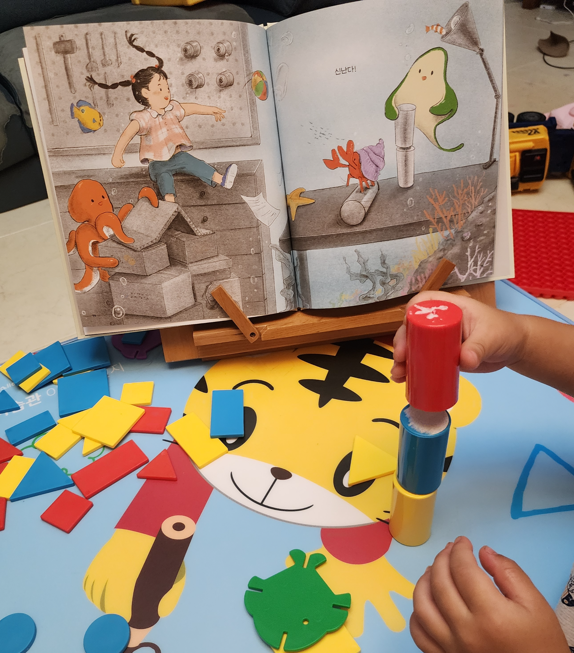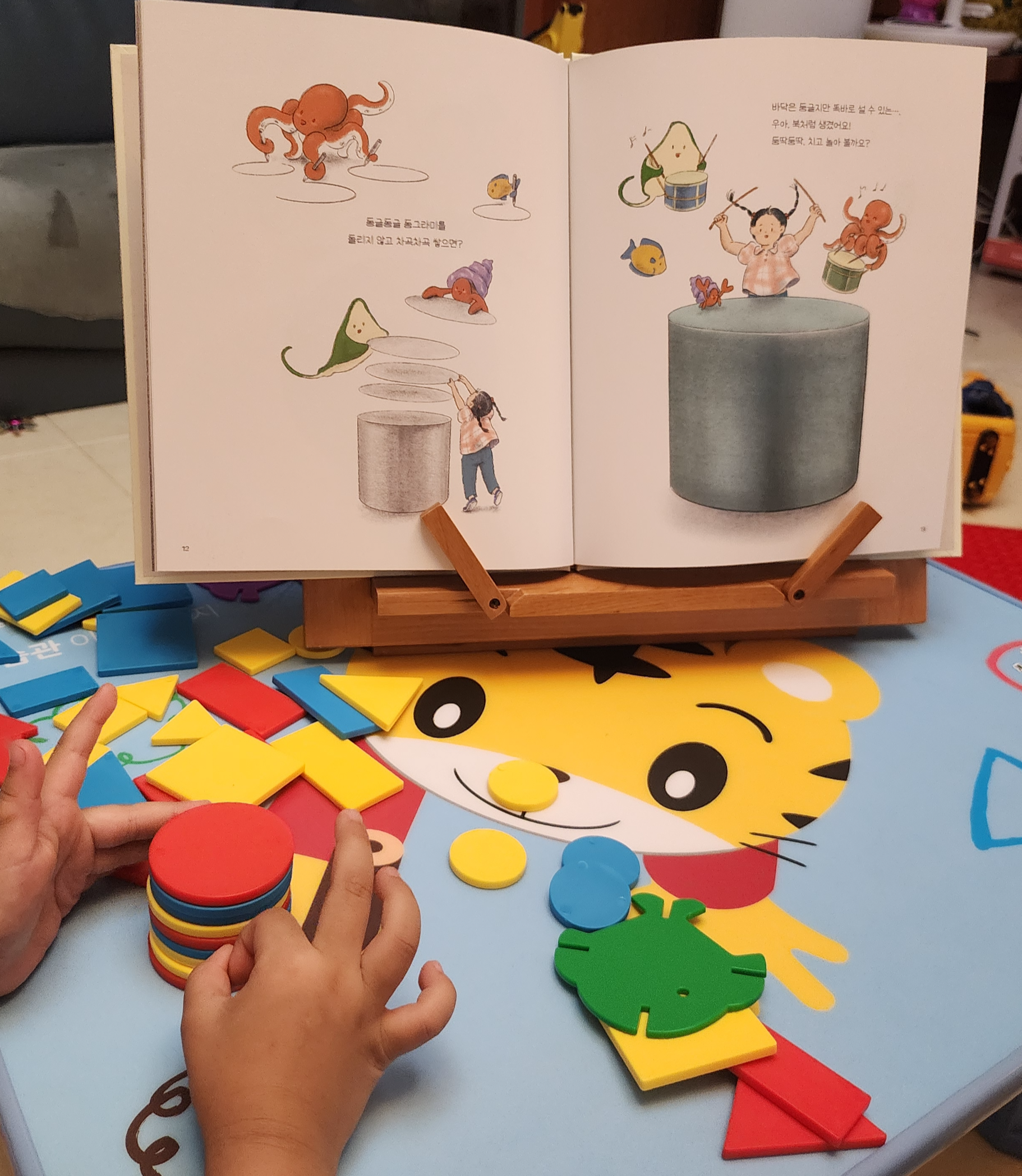 아이가 책만 보고 이해할 수 있을까 싶어서 그림과 비슷한 도형교구들을 꺼냈다.
